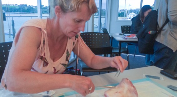 Dean learning to sew stitches on a pigs trotter (close to human skin).